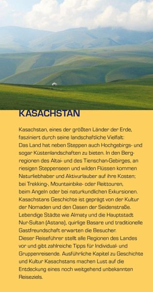 - Einziger deutschsprachiger Reiseführer zu Kasachstan- Alle Regionen Kasachstans auf 504 Seiten, vom Altai bis zum Kaspischen Meer- Tipps für Individual- und Gruppenreisende, genaue Informationen zur Reiseplanung- Mehr als 400 Unterkünfte vom Camp bis zum Luxushotel, viele Restauranttipps- 350 Fotos, 28 Übersichtskarten und Stadtpläne, Reisetipps von A bis Z