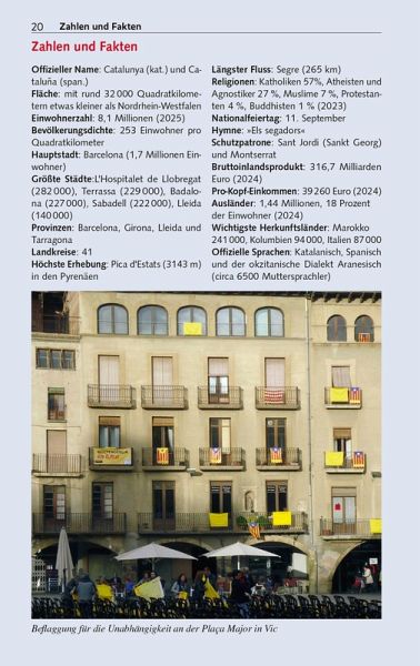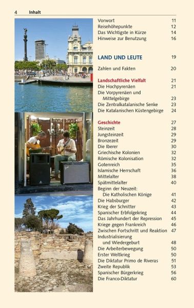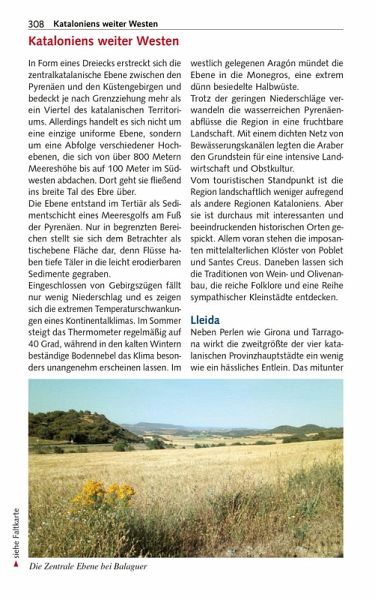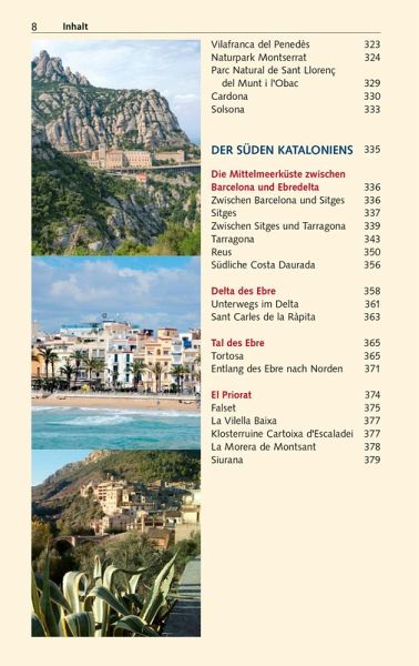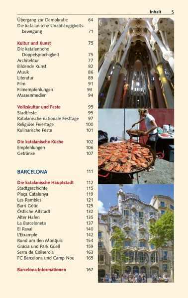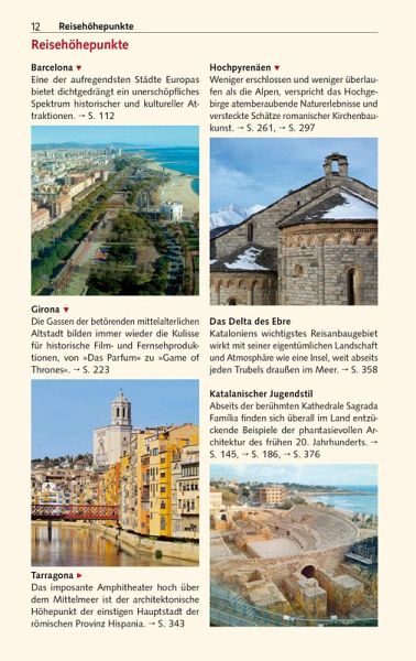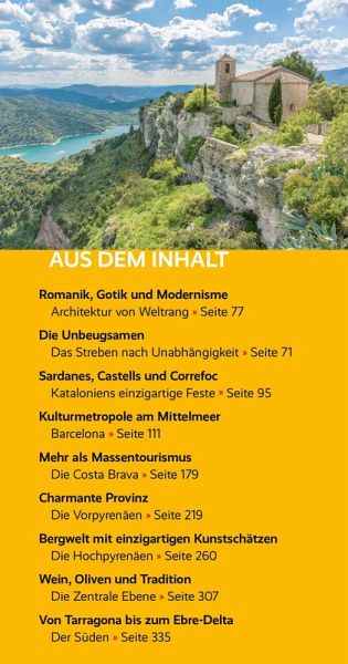 Mittelalterliche Dörfer, Kirchen und Klöster schmücken das Land. In den Hohen Pyrenäen sind die romanischen Dorfkirchen im Vall de Boi Teil des UNESCO-Welterbes. Der Nationalpark Aigüestortes i Estany de Sant Maurici im Hochgebirge zählt zu Spaniens schönsten Wandergebieten. An der südlichen Costa Daurada warten Tarragona mit römischen Amphitheater und das Städtchen Reus mit Jugendstil auf. Schließlich die katalanische Küche: Mal rustikal, mal raffiniert, gleicht sie einer Entdeckung