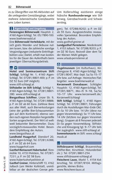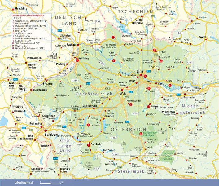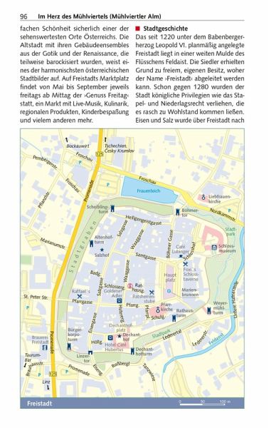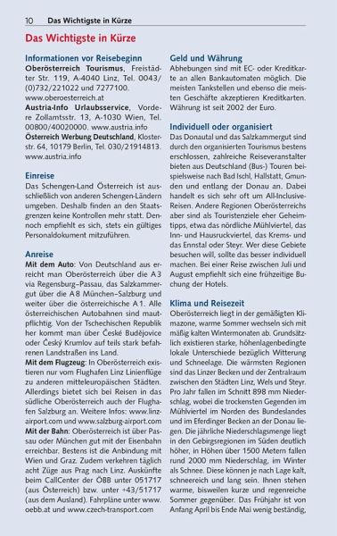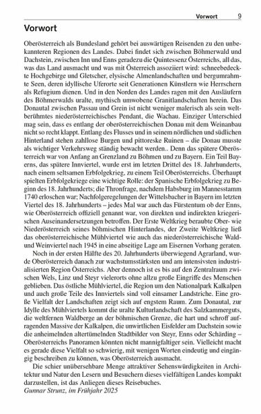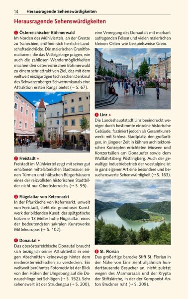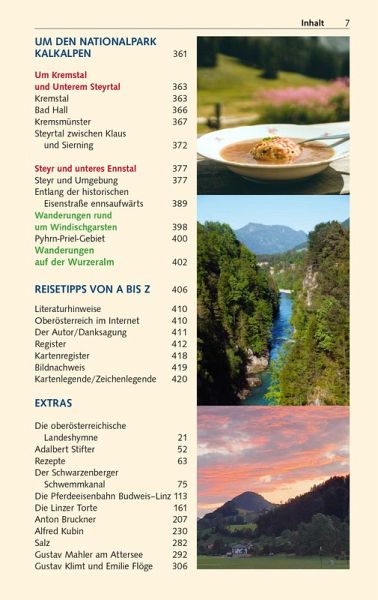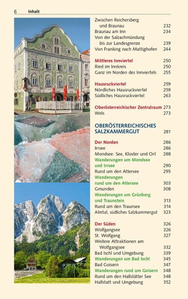 Vorwort 9Das Wichtigste in Kürze 10Unterwegs mit Kindern 12Herausragende Sehenswürdigkeiten 14Entfernungstabelle 16LAND _UND_ LEUTE 19Oberösterreich im Überblick 20Natur und Mensch 22Geographie 22Geologie 24Tier- und Pflanzenwelt 27Wirtschaft und Tourismus 28Klima und Reisezeit 29Bevölkerung und Sprache 30Geschichte Oberösterreichs 31Von der Urzeit bis zum frühen Mittelalter 32Vom frühen Mittelalter bis zur Reformation 33Reformation und Gegenreformation 37Der Oberösterreichische Bauernkrieg 39Vom Ausgang des 17. Jahrhunderts bis in die napoleonische Zeit 41Das 19. Jahrhundert 44Das 20. Jahrhundert 46Politik und Verwaltung 50Kunst und Kultur 54Literatur 54Musik 56Architektur 56Malerei 59Feste und Festivals 60Essen und Trinken 62MÜHLVIERTEL 65Böhmerwald 67Im äußersten Nordwesten 68Aigen-Schlägl 77Stift Schlägl 77Von Rohrbach nach Bad Leonfelden 83Bad Leonfelden und Umgebung 88Im Herz des Mühlviertels (Mühlviertler Alm) 95Freistadt 95Die südliche und östliche Umgebung Freistadts 101 Die westliche Umgebung Freistadts 111Zwischen Freistadt und der böhmischen Grenze 116Wanderungen rund um Sandl 121Der Osten des Mühlviertels 122Von Liebenau nach St. Georgen 122Von Bad Zell in den Strudengau 127Mühlviertler Granitland 135ENTLANG DER DONAU 143Von der Grenze bis Linz 145Nördliche Donauseite 145Südliche Donauseite 151Linz 163Stadtgeschichte 164Bedeutende Persönlichkeiten 168Historische Innenstadt 169Außerhalb der Innenstadt 182Leonding 186Zwischen Linz und der niederösterreichischen Grenze 191Von Linz bis in das Machland 191Machland 195Strudengau 200 Stift St. Florian 209Enns 213INNVIERTEL 221Entlang von Inn und Salzach 224Schärding 224Zwischen Reichersberg und Braunau 232Braunau am Inn 234Von der Salzachmündung bis zur Landesgrenze 239Von Franking nach Mattighofen 244Mittleres Innviertel 250Ried im Innkreis 250Ganz im Norden des Innviertels 255Hausruckviertel 259Nördliches Hausruckviertel 259Südliches Hausruckviertel 263Oberösterreichischer Zentralraum 273Wels 273OBERÖSTERREICHISCHES SALZKAMMERGUT 281Der Norden 286Irrsee 286Mondsee: See, Kloster und Ort 288Wanderungen um Mondsee und Irrsee 290Rund um den Attersee 295Wanderungen rund um den Attersee 303Gmunden 308Wanderungen um Grünberg und Traunstein 313Rund um den Traunsee 314Almtal, südliches Salzkammergut 323Der Süden 326Wolfgangsee 326St. Wolfgang 327Weitere Attraktionen am Wolfgangsee 332Bad Ischl und Umgebung 339Wanderungen um Bad Ischl 345Bad Goisern 347Wanderungen rund um Goisern 348Rund um den Hallstätter See 348Hallstatt und Umgebung 352UM DEN NATIONALPARK KALKALPEN 361Um Kremstal und Unterem Steyrtal 363Kremstal 363Bad Hall 366Kremsmünster 367Steyrtal zwischen Klaus und Sierning 372Steyr und unteres Ennstal 377Steyr und Umgebung 377Entlang der historischen Eisenstraße ennsaufwärts 389Wanderungen rund um Windischgarsten 398Pyhrn-Priel-Gebiet 400Wanderungen auf der Wurzeralm 402Reisetipps von A bis Z 406Literaturhinweise 410Oberösterreich im Internet 410Der Autor/Danksagung 411Register 412Kartenregister 418Bildnachweis 419Kartenlegende/Zeichenlegende 420EXTRASDie oberösterreichische Landeshymne 21Adalbert Stifter 52Rezepte 63Der Schwarzenberger Schwemmkanal 75Die Pferdeeisenbahn Budweis-Linz 113Die Linzer Torte 161Anton Bruckner 207Alfred Kubin 230Salz 282Gustav Mahler am Attersee 292Gustav Klimt und Emilie F