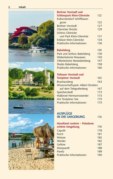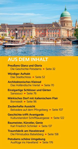 Große Baumeister und Einwanderer aus vielen Ländern haben ihre Spuren hinterlassen. Neben der barocken und klassizistischen Innenstadt legen das Holländische Viertel, die böhmische Weberkolonie Nowawes oder die russische Kolonie Alexandrowka davon Zeugnis ab. Mit dem Studio Babelsberg schaut Potsdam auf über 100 Jahre Filmgeschichte zurück. Und auch das aktuelle Kulturangebot kann sich sehen lassen. Der Veranstaltungskalender ist prall gefüllt - gekrönt von der Potsdamer Schlössernacht, wenn vor der Kulisse der illuminierten Schlösser Konzerte, Tanz und Theater zur Aufführung kommen. Ausflüge führen in die schöne Umgebung im Havelland, wo in Werder und Caputh, Geltow oder Paretz weitere Sehenswürdigkeiten auf ihre Entdeckung warten.