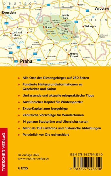 Mitteleuropas höchste Gipfel nördlich der Alpen erheben sich im Riesengebirge. Natur- und Aktivurlauber finden hier unverfälschte Landschaften, traditionsreiche Orte und eine Fülle von Wander- und Wintersportmöglichkeiten. Als Wegbegleiter empfiehlt sich der Trescher-Reiseführer RIESENGEBIRGE, der alles Sehens- und Erlebenswerte im Land von Schneekoppe und Rübezahl kundig und unterhaltsam beschreibt.