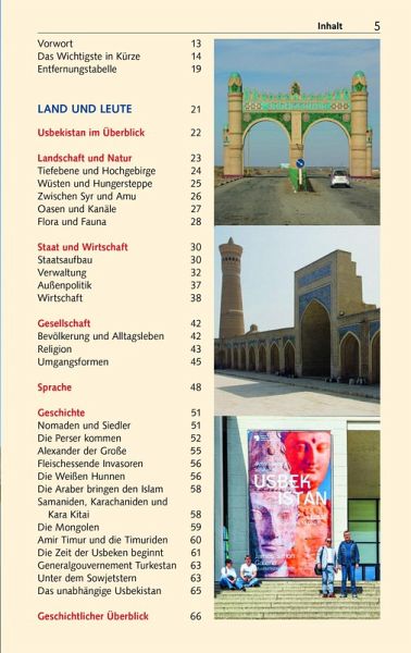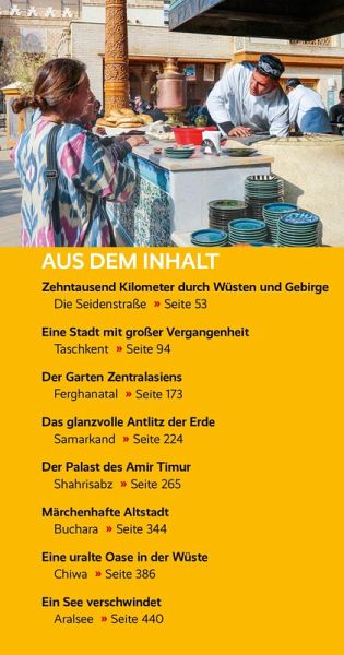 Von den westlichen Wüsten bis östlich zum Pamir-Gebirge, vom nördlichen Aralsee bis südlich zum Hindukusch erstreckt sich Usbekistan im Zentrum der alten Seidenstraße. Schon in der Antike verband die sagenumwobene Handelsstraße Fernost mit Europa, und noch heute schlagen die alten Oasenstädte Reisende in ihren Bann. Samarkand: Meisterwerk islamischer Baukunst wie aus Tausendundeiner Nacht. Chiwa zwischen Roter und Schwarzer Sandwüste: Altstadt, Moscheen, Paläste und Zitadelle sind komplett von mächtigen Festungsmauern umgeben. Buchara: märchenhafte Wüstenstadt, über 2500 Jahre alt, mit Palästen, Moscheen, Medresen und bunten Basaren. Schließlich Shahrisabz, Geburtsstadt des berüchtigten Eroberers Amir Timur. Alle vier Oasenstädte sind UNESCO-Welterbe, wegen ihrer mit filigranen blauen Mosaiken versehenen Bauwerke auch "blaue Edelsteine" genannt.