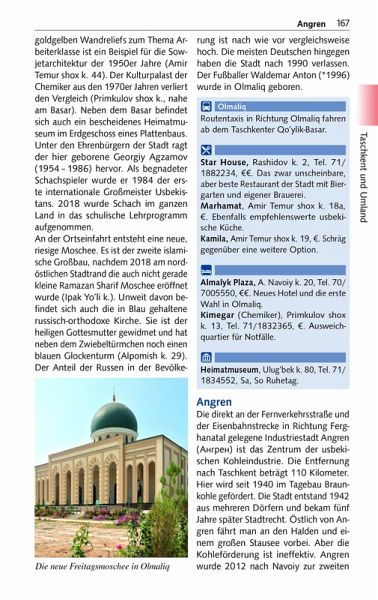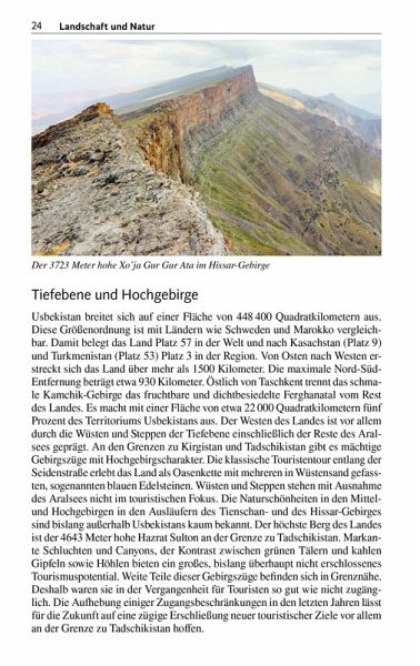 Die Hauptstadt Taschkent besticht mit ihrem Mix aus grünen Parks, traditioneller und sowjetischer Architektur. Das Ferghanatal im Dreiländereck Usbekistan, Kirgistan, Kasachstan, die Wüste Kyzylkum oder eine Fahrt zum schwindenden Aralsee zählen zu den beeindruckenden Naturerlebnissen. Die Wüstenfestungen am Amudaryo, Reste buddhistischer Klöster und zoroastrischer Feuertempel zeugen von der reichen Geschichte. Viele weitere spannende Entdeckungen, Basare mit orientalischem Flair und eine herzliche Gastfreundschaft erwarten die Besucher im Land.