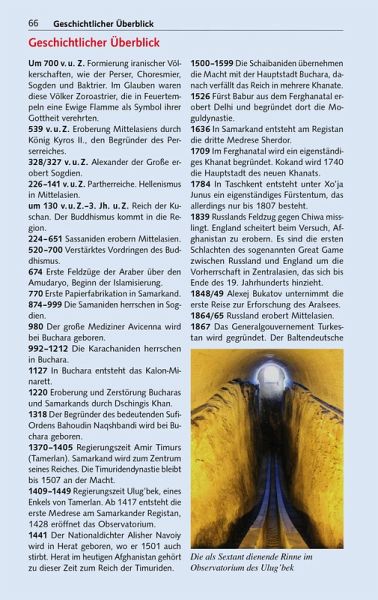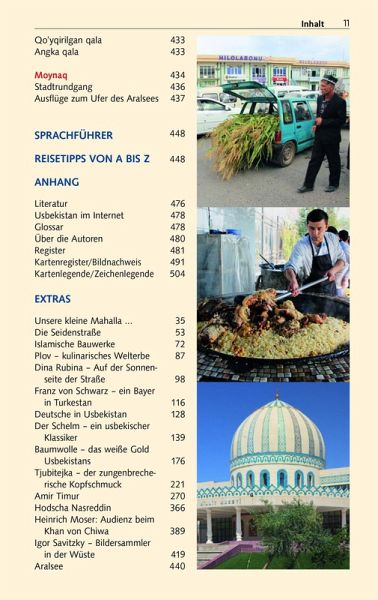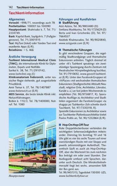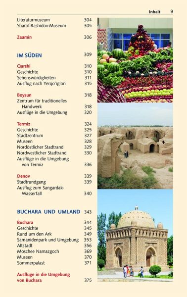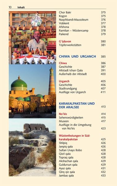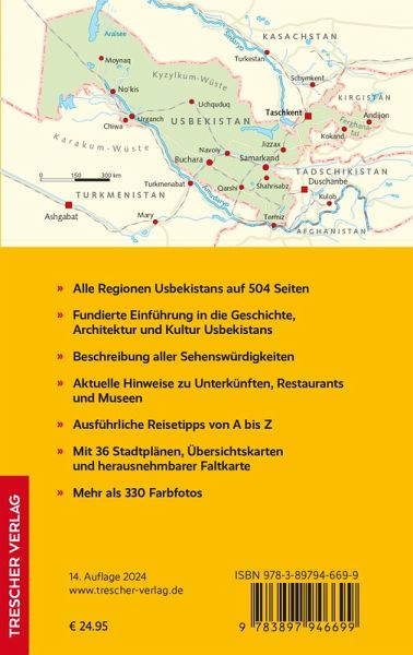 Die Autoren des Trescher-Reiseführers USBEKISTAN, Irina und Bodo Thöns, leben im Land und kennen es wie ihre Westentasche. Alle Regionen und ihre Sehenswürdigkeiten werden von ihnen umfassend beschrieben, auch die abseits der touristischen Routen. Landeskundliche Kapitel führen ein in Geografie und Natur, beleuchten Geschichte und Kultur, die Traditionen und den Alltag der Menschen. Empfehlungen für Hotels, Jurtencamps, Restaurants und Basare, viele Stadtpläne, ein herausnehmbarer Faltplan sowie ausführliche reisepraktische Tipps ergänzen diesen allseits zuverlässigen Wegbegleiter.