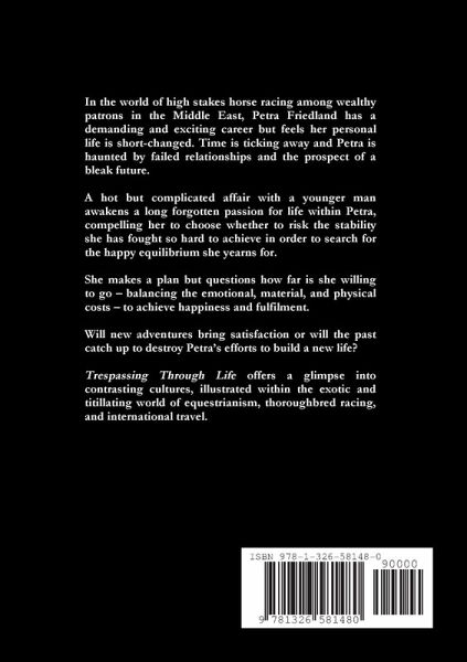 In the world of high stakes horse racing among wealthy patrons in the Middle East, Petra Friedland has a demanding and exciting career but feels her personal life is short-changed. Time is ticking away and Petra is haunted by failed relationships and the prospect of a bleak future. A hot but complicated affair with a younger man awakens a long forgotten passion for life within Petra, compelling her to choose whether to risk the stability she has fought so hard to achieve in order to search for the happy equilibrium she yearns for. She makes a plan but questions how far is she willing to go - balancing the emotional, material, and physical costs - to achieve happiness and fulfilment. Will new adventures bring satisfaction or will the past catch up to destroy Petra's efforts to build a new life? Trespassing Through Life offers a glimpse into contrasting cultures, illustrated within the exotic and titillating world of equestrianism, thoroughbred racing, and international travel.