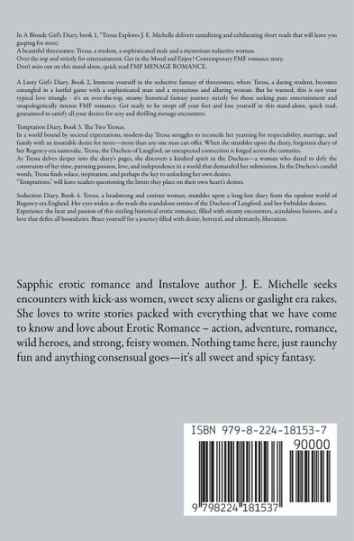 In A Blonde Girl's Diary, book 1, "Tressa Explores J. E. Michelle delivers tantalizing and exhilarating short reads that will leave you gasping for more. A beautiful threesomes; Tressa, a student, a sophisticated male and a mysterious seductive woman. Over the top and strictly for entertainment. Get in the Mood and Enjoy! Contemporary FMF romance story. Don't miss out on this stand-alone, quick read FMF MENAGE ROMANCE. A Lusty Girl's Diary, Book 2, Immerse yourself in the seductive fantasy of threesomes, where Tressa, a daring student, becomes entangled in a lustful game with a sophisticated man and a mysterious and alluring woman. But be warned, this is not your typical love triangle - it's an over-the-top, steamy historical fantasy journey strictly for those seeking pure entertainment and unapologetically intense FMF romance. Get ready to be swept off your feet and lose yourself in this stand-alone, quick read, guaranteed to satisfy all your desires for sexy and thrilling menage encounters. Temptation Diary, Book 3. The Two Tressas. In a world bound by societal expectations, modern-day Tressa struggles to reconcile her yearning for respectability, marriage, and family with an insatiable desire for more-more than any one man can offer. When she stumbles upon the dusty, forgotten diary of her Regency-era namesake, Tressa, the Duchess of Langford, an unexpected connection is forged across the centuries. As Tressa delves deeper into the diary's pages, she discovers a kindred spirit in the Duchess-a woman who dared to defy the constraints of her time, pursuing passion, love, and independence in a world that demanded her submission. In the Duchess's candid words, Tressa finds solace, inspiration, and perhaps the key to unlocking her own desires. "Temptations," will leave readers questioning the limits they place on their own heart's desires. Seduction Diary, Book 4. Tressa, a headstrong and curious woman, stumbles upon a long-lost diary from the opulent world of Regency-era England. Her eyes widen as she reads the scandalous entries of the Duchess of Langford, and her forbidden desires. Experience the heat and passion of this sizzling historical erotic romance, filled with steamy encounters, scandalous liaisons, and a love that defies all boundaries. Brace yourself for a journey filled with desire, betrayal, and ultimately, liberation.