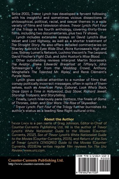 Since 2001, Trevor Lynch has developed a fervent following with his insightful and sometimes vicious dissections of philosophical, political, racial, and sexual themes in a wide variety of films and television shows. Trevor Lynch: Part Four of the Trilogy is his fourth anthology, covering thirty-three films, including two documentaries, plus two TV shows. Lynch includes extensive essays on David Lynch's Blue Velvet and Lost Highway, as well as a shorter treatment of The Straight Story. He also offers detailed commentaries on Stanley Kubrick's Eyes Wide Shut, Akira Kurosawa's High and Low, Sidney Lumet's Network, Luchino Visconti's The Leopard, David Fincher's Fight Club, and John Huston's Wise Blood. Other outstanding reviews interpret Martin Scorsese's The Aviator, Blake Edwards' Breakfast at Tiffany's, John Schlesinger's Far from the Madding Crowd, Anthony Minghella's The Talented Mr. Ripley, and René Clément's Purple Noon. Lynch gives special attention to a number of films that convey politically incorrect messages, often in spite of themselves, such as American Pimp, Cabaret, Look Who's Back, Once Upon a Time in Hollywood, Quiz Show, Richard Jewell, Starship Troopers, and Storytelling. Finally, Lynch hilariously pans Gattaca, the finale of Game of Thrones, Joker, and Star Wars: The Rise of Skywalker. Trevor Lynch: Part Four of the Trilogy further burnishes its author's status as a leading New Right cultural critic.