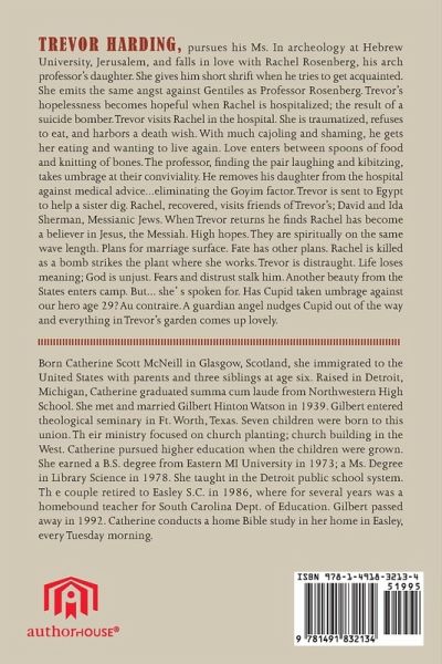 TREVOR HARDING, pursues his Ms. In archeology at Hebrew University, Jerusalem, and falls in love with Rachel Rosenberg, his arch professor's daughter. She gives him short shrift when he tries to get acquainted. She emits the same angst against Gentiles as Professor Rosenberg. Trevor's hopelessness becomes hopeful when Rachel is hospitalized; the result of a suicide bomber. Trevor visits Rachel in the hospital. She is traumatized, refuses to eat, and harbors a death wish. With much cajoling and shaming, he gets her eating and wanting to live again. Love enters between spoons of food and knitting of bones. The professor, finding the pair laughing and kibitzing, takes umbrage at their conviviality. He removes his daughter from the hospital against medical advice...eliminating the Goyim factor. Trevor is sent to Egypt to help a sister dig. Rachel, recovered, visits friends of Trevor's; David and Ida Sherman, Messianic Jews. When Trevor returns he finds Rachel has become a believer in Jesus, the Messiah. High hopes. They are spiritually on the same wave length. Plans for marriage surface. Fate has other plans. Rachel is killed as a bomb strikes the plant where she works. Trevor is distraught. Life loses meaning; God is unjust. Fears and distrust stalk him. Another beauty from the States enters camp. But... she' s spoken for. Has Cupid taken umbrage against our hero age 29? Au contraire. A guardian angel nudges Cupid out of the way and everything in Trevor's garden comes up lovely.