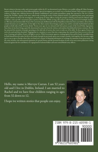 Brexit is about to become reality and certain people within the EU are determined to give Britain a very public telling off. Other European nations must be diverted away from following Britain. Special investigators are on their way to Northern Ireland. Their mission is to gather evidence of illegal state collusion between the British establishment and Loyalist paramilitary gangs that operated in The Six Counties during The Troubles. Agents of the state, tasked with covering the tracks of their political masters, are gathering their assets and putting in place schemes to thwart the investigation. A small group of Army officers, facing the prospect of being prosecuted for Human rights violations, come up with a treasonous plan to protect themselves. While serving a life sentence after being convicted of multiple murders, ex- IRA man and notorious killer Francis Mc Carron became disillusioned with the Republican ideals that had, years before, driven him to commit ferocious acts of aggression. In the fight to free their country from foreign occupiers, he and his comrades had bombed and shot people on both sides of the sectarian divide. Twenty years ago, he was released early from prison as part of the Good Friday Agreement. Since then, he has been living a quiet life, determined to stay away from the violence and mayhem that defined his former existence. But, he has attracted the attention of people operating on the dark side of society, they want to make use of his skills. To these agents, Francis is a tool to be used and then discarded. Trapping him in a situation to coerce him into cooperating, they instead force him to revert to his old ways. Cunning and ruthless, Francis will fight to survive. With Government agencies working against him and his hastily assembled team, he finds himself forced to place his life in the hands of people he previously spent years trying to murder. And together, they become caught up in a race to get to Europe where they can hand over a dossier of damning information in exchange for immunity from prosecution. On the scales of justice, the international reputation of a proud Nation and the personal freedom of some of its most senior politicians is being balanced against the lives and liberty of a ragtag band of reformed killers and semi-retired British army officers.