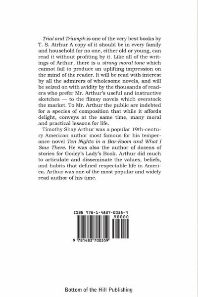 Trial and Triumph is one of the very best books by T. S. Atrhur A copy of it should be in every family and household for no one, either old or young, can read it without profiting by it. Like all of the writings of Arthur, there is a strong moral tone which cannot fail to produce an uplifting impression on the mind of the reader. It will be read with interest by all the admirers of wholesome novels, and will be seized on with avidity by the thousands of readers who prefer Mr. Arthur's useful and instructive sketches - to the flimsy novels which overstock the market. To Mr. Arthur the public are indebted for a species of composition that while it affords delight, conveys at the same time, many moral and practical lessons for life. Timothy Shay Arthur was a popular 19th-century American author most famous for his temperance novel Ten Nights in a Bar-Room and What I Saw There. He was also the author of dozens of stories for Godey's Lady's Book. Arthur did much to articulate and disseminate the values, beliefs, and habits that defined respectable life in America. Arthur was one of the most popular and widely read author of his time.