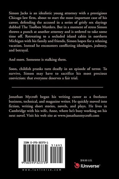 Simon Jacks is an idealistic young attorney with a prestigious Chicago law firm, about to start the most important case of his career, defending the accused in a series of grisly sex slayings dubbed The Toolbox Murders. But in a moment of stress Simon throws a punch at another attorney and is ordered to take some time off. Retreating to a secluded island cabin in northern Michigan with his family and friends, Simon hopes for a relaxing vacation. Instead he encounters conflicting ideologies, jealousy, and betrayal. And more. Someone is stalking them. Soon, childish pranks turn deadly in an episode of terror. To survive, Simon may have to sacrifice his most precious conviction: that everyone deserves a fair trial.