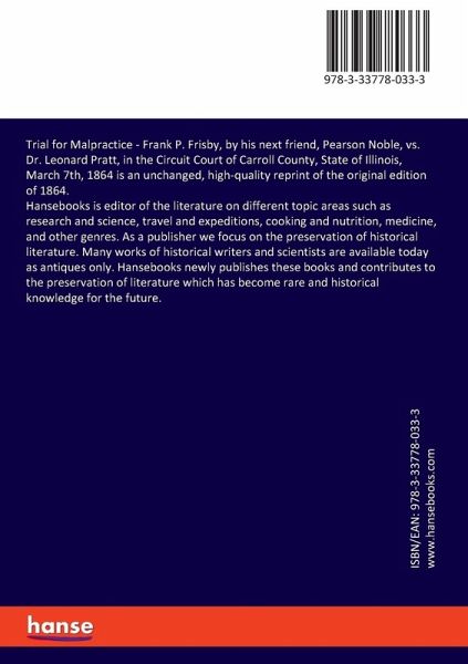 Trial for Malpractice - Frank P. Frisby, by his next friend, Pearson Noble, vs. Dr. Leonard Pratt, in the Circuit Court of Carroll County, State of Illinois, March 7th, 1864 is an unchanged, high-quality reprint of the original edition of 1864.