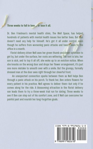 Three weeks to fall in love ... or lose it all. Dr. Ben Friedman's mental health clinic, The Well Space, has helped hundreds of patients with mental health issues live better lives. But Ben doesn't need any help for himself. He's got it all under control, even though he suffers from worsening panic attacks and hasn't been to the office in a month. Florist delivery driver Nell uses her green thumb and sheer optimism to get by, but under the surface, her roots are withering. The rent is late, her son is sick, and to top it all off, she woke up to an eviction notice. When she knocks on the wrong door and drops her flower arrangement, it's just one more mistake to smooth over with a smile. But the grumpy, formally dressed man at the door sees right through her cheerful front. An unexpected connection sparks between them as Nell helps Ben through a panic attack on his porch. To thank her, Ben orders flowers for every patient in his practice. Nell agrees to deliver them-but only if he comes along for the ride. A blossoming attraction in the florist delivery van leads them to try a three-week trial run for dating. Three weeks to see if Ben can step out of his comfort zone, and if Nell can overcome her painful past and nourish her long-forgotten goals.