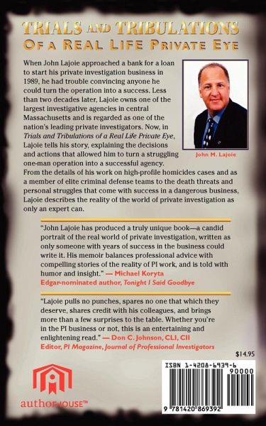 When John Lajoie approached a bank for a loan to start his private investigation business in 1989, he had trouble convincing anyone he could turn the operation into a success. Less than two decades later, Lajoie owns one of the largest investigative agencies in central Massachusetts and is regarded as one of the nation's leading private investigators. Now, in Trials and Tribulations of a Real Life Private Eye, Lajoie tells his story, explaining the decisions and actions that allowed him to turn a struggling one-man operation into a successful agency. From the details of his work on high-profile homicides cases and as a member of elite criminal defense teams to the death threats and personal struggles that come with success in a dangerous business, Lajoie describes the reality of the world of private investigation as only an expert can. "John Lajoie has produced a truly unique book- a candid portrait of the real world of private investigation, written as only someone with years of success in the business could write it. His memoir balances professional advice with compelling stories of the reality of PI work, and is told with humor and insight." Michael Koryta, Edgar-nominated author, Tonight I Said Goodbye "Lajoie pulls no punches, spares no one that which they deserve, shares credit with his colleagues, and brings more than a few surprises to the table. Whether you're in the PI business or not, this is an entertaining and enlightening read." Don C. Johnson, CLI, CII, Editor, PI Magazine, Journal of Professional Investigators