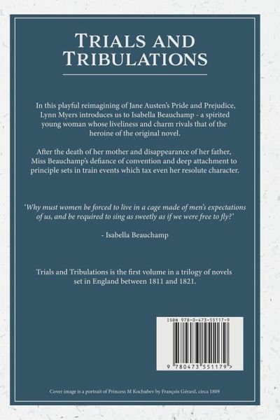In this playful reimagining of Jane Austen's Pride and Prejudice, Lynn Myers introduces us to Miss Isabella Beauchamp - a spirited young woman whose liveliness and charm rivals that of the heroine of the original novel. Miss Beauchamp's attachment to principle and her defiance of convention sets in train a series of events which taxes even her resolute character. Trials and Tribulations is the first volume in a trilogy of novels set in England in the years between 1811 and 1820.