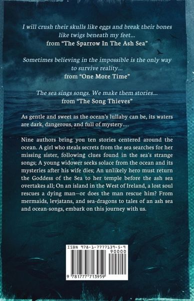As gentle and sweet as the ocean's lullaby can be, its waters are dark, dangerous, and full of mystery.... Dive in and explore ten original stories centered around the ocean. You'll find something for everyone, from benevolent mermaids to powerful levjatans; stolen secrets and forbidden stories. Meet pirates and thieves, sea dragons and gods in these tales of action, grief, romance, and mystery! ~ The Song Thieves - Eleanor Owen A girl who steals secrets from the sea searches for her missing sister. Manannan's Daughter - Christiana Matthews Mortals are all very well to use as playthings, but Cliohna's decisions anger her father, with disastrous results. Son of the Sea - Aisling Wilder On an island in the West of Ireland, a lost soul rescues a dying man-or does the man rescue him? The Delivery - Barend Nieuwstraten III Escorting a coffin across the southern sea turns into a harrowing experience. The Storyteller - R. L. Davennor An elderly storyteller is forced to recall the one tale she swore never to utter. Cost of the Crown - Ine Gausel Prince Coral has always been told that the sea is a dark and dangerous place, but something he finds on shore will change his life forever. Heart of Amber - Kida Langås After a storm brings two lost unlikely friends together they have a difficult choice to make One More Time - A. M. Dilsaver A young widower seeks solace from the ocean and its mysteries after his wife dies. The Calling - A. M. Dilsaver Torn between her true love and the ocean, Cordelia must make a choice that will change her life forever. The Sparrow in the Ash Sea - S. K. Sayari An unlikely hero must return the Goddess of the Sea to her temple before the ash sea overtakes all.