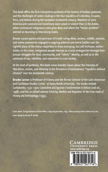 This book offers the first interpretive synthesis of the history of Andean peasants and the challenges of nation-making in the four republics of Colombia, Ecuador, Peru, and Bolivia during the turbulent nineteenth century. Nowhere in Latin America were postcolonial transitions more vexed or violent than in the Andes, where communal indigenous roots grew deep and where the 'Indian problem' seemed so daunting to liberalizing states. Brooke Larson paints vivid portraits of Creole ruling élites and native peasantries engaged in ongoing political and moral battles over the rightful place of the Indian majorities in these emerging nation-states. In this story, indigenous people emerge as crucial protagonists through their prosaic struggles for land, community, and 'ethnic' identity, as well as in the upheaval of war, rebellion, and repression in rural society. This book raises broader issues about the interplay of liberalism, racism, and ethnicity in the formation of exclusionary 'republics without citizens'.