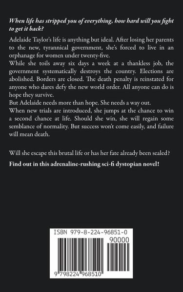 When life has stripped you of everything, how hard will you fight to get it back? Adelaide Taylor's life is anything but ideal. After losing her parents to the new, tyrannical government, she's forced to live in an orphanage for women under twenty-five. While she toils away six days a week at a thankless job, the government systematically destroys the country. Elections are abolished. Borders are closed. The death penalty is reinstated for anyone who dares defy the new world order. All anyone can do is hope they survive. But Adelaide needs more than hope. She needs a way out. When new trials are introduced, she jumps at the chance to win a second chance at life. Should she win, she will regain some semblance of normality. But success won't come easily, and failure will mean death. Will she escape this brutal life or has her fate already been sealed? Find out in this adrenaline-rushing sci-fi dystopian novel!