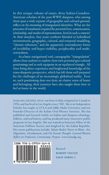 In this unique volume of essays, three Italian-Canadian-American scholars of the post-WWII diaspora, who among them span a wide expanse of geographic and cultural ground, reflect on the meaning of triangulated identities. What are the processes of translation required by personal lives, consciousness, scholarship, and modes of representation, lived in such a context? At their simplest, they must confront blended or hybridized environments, geographic, cultural, and temporal straddling, "chronic otherness," and the apparently contradictory forms of invisibility and hyper-visibility, peripherality and multi-centredness. As a basic navigational tool, cartographic "triangulation" allows these authors to explore their own personal geo-cultural positionings and to seek equipoise in an equilateral triangle. All three bring direct experience and heightened knowledge of the trans-diasporic perspective, which has left them well-prepared for the challenges of an increasingly globalized reality. Even so, such positioning does not deny an elusive sense of home and belonging; their journeys have also taught them how to feel at home in the world.