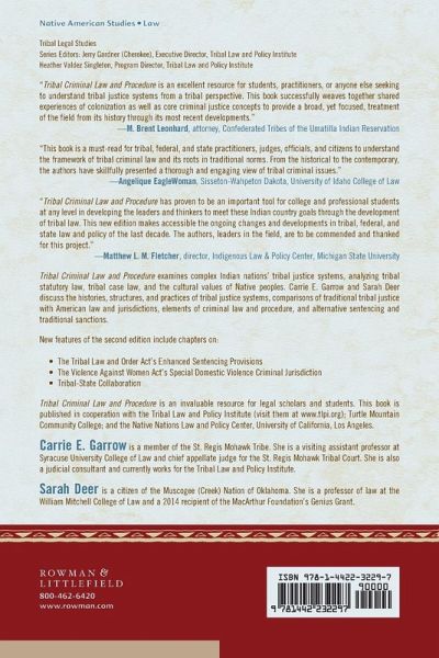 This book examines the complex subject of tribal criminal law and procedure from a tribal perspective utilizing tribal statutory law, tribal case law, and the cultural values of Native peoples. Garrow and Deer discuss in depth the histories, structures and practices of tribal justice systems, comparisons of traditional tribal justice with Anglo-American law and jurisdictions, elements of criminal law and procedure, and alternative sentencing and traditional sanctions. Published in cooperation with the Tribal Law and Policy Institute, Tribal Criminal Law and Procedure will be an invaluable resource for legal scholars and students.