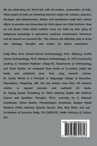We are celebrating the 'Amrit Kal' with all sections, communities of India. Tribal people of India are remaining heuristic subject for scholars, planners, developer and administrators. Editors and contributors made their utmost efforts to provide new dimensions for think about our tribal brethren. Our autochthonous people are responsible for building the resources, culture, and morality of ancient India. Now we can found tribal nation builders serve our India by their glory of indigenous knowledge in agriculture, medicine, environment, literatures and all around our practical life. Research and innovations for future India are essentially depends upon tribal scholars in the sectors of science, technology, space, sports, polity and clinical domain also. This volume will definitely help to bring new ideology, thoughts and actions for future researchers.