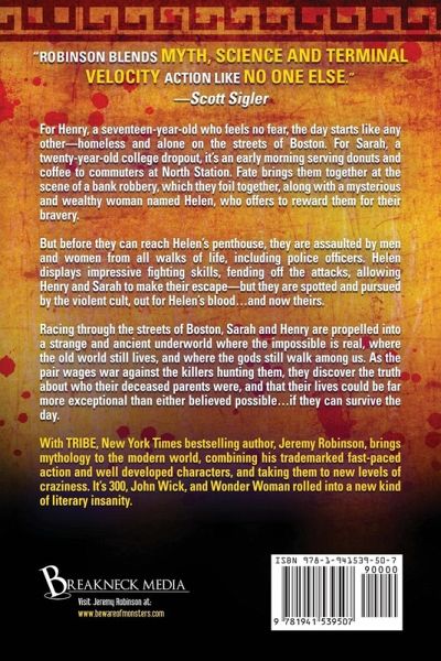 For Henry, a seventeen-year-old who feels no fear, the day starts like any other--homeless and alone on the streets of Boston. For Sarah, a twenty-year-old college dropout, it's an early morning serving donuts and coffee to commuters at North Station. Fate brings them together at the scene of a bank robbery, which they foil together, along with a mysterious and wealthy woman named Helen, who offers to reward them for their bravery. But before they can reach Helen's penthouse, they are assaulted by men and women from all walks of life, including police officers. Helen displays impressive fighting skills, fending off the attacks, allowing Henry and Sarah to make their escape--but they are spotted and pursued by the violent cult, out for Helen's blood...and now theirs. Racing through the streets of Boston, Sarah and Henry are propelled into a strange and ancient underworld where the impossible is real, where the old world still lives, and where the gods still walk among us. As the pair wages war against the killers hunting them, they discover the truth about who their deceased parents were, and that their lives could be far more exceptional than either believed possible...if they can survive the day. With TRIBE, New York Times bestselling author, Jeremy Robinson, brings mythology to the modern world, combining his trademarked fast-paced action and well developed characters, and taking them to new levels of craziness. It's 300, John Wick, and Wonder Woman rolled into a new kind of literary insanity.