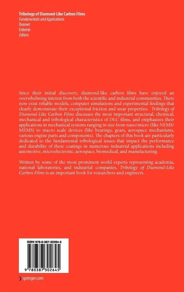 General Overview on DLC Coatings.- Classification of Diamond-like Carbons.- Non-destructive Characterisation of Carbon Films.- Mechanical Characterisation and Properties of DLC Films.- Residual Stresses in DLC Films and Adhesion to Various Substrates.- Tribology of DLC Coatings Fundamentals and Experimental Studies.- Fundamentals of the Tribology of DLC Coatings.- Environmental and Thermal Effects on the Tribological Performance of DLC Coatings.- Third Bodies and Tribochemistry of DLC Coatings.- An Overview of Superlubricity in Diamond-like Carbon Films.- Hard DLC Growth and Inclusion in Nanostructured Wear-protective Coatings.- Environmental and Surface Chemical Effects on Tribological Properties of Carbon-based Coatings.- Triboemission and Triboplasma Generation with DLC Films.- Doping and Alloying Effects on DLC Coatings.- Tribology of Carbon Nitride Coatings.- Tribology of DLC Films Under Fretting Conditions.- Tribology of DLC Films Under Slip-Rolling Conditions.- Tribological Behavior of DLC Films in Various Lubrication Regimes.- Applications and Future Trends in DLC's Tribology.- Industrial Production of DLC Coatings.- DLC Films in Mechanical and Manufacturing Industry.- Wear Resistance of Amorphous DLC and Metal Containing DLC in Industrial Applications.- DLC Films in Biomedical Applications.- Nanotribology of Ultrathin and Hard Amorphous Carbon Films.- Laser Processing of Tribological DLC Films: An Overview.- New Trends in Boundary Lubrication of DLC Coatings.- Fullerene-like Carbon Nitride: A New Carbon-based Tribological Coating.