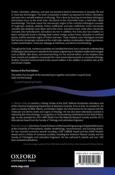 Friction, lubrication, adhesion, and wear are prevalent physical phenomena in everyday life and in many key technologies. This book incorporates a bottom-up approach to friction, lubrication, and wear into a versatile textbook on tribology. This is done by focusing on how these tribological phenomena occur on the small scale -- the atomic to the micrometer scale -- a field often called nanotribology. The book covers the microscopic origins of the common tribological concepts of roughness, elasticity, plasticity, friction coefficients, and wear coefficients. Some macroscale concepts (like elasticity) scale down well to the micro- and atomic-scale, while other macroscale concepts (like hydrodynamic lubrication) do not. In addition, this book also has chapters on topics not typically found in tribology texts: surface energy, surface forces, lubrication in confined spaces, and the atomistic origins of friction and wear. These chapters cover tribological concepts that become increasingly important at the small scale: capillary condensation, disjoining pressure, contact electrification, molecular slippage at interfaces, atomic scale stick-slip, and atomic bond breaking. Throughout the book, numerous examples are provided that show how a nanoscale understanding of tribological phenomena is essential to the proper engineering of important modern technologies such as MEMS, disk drives, and nanoimprinting. For the second edition, all the chapters have been revised and updated to incorporate the most recent advancements in nanoscale tribology. Another important enhancement to the second edition is the addition of problem sets at the end of each chapter.