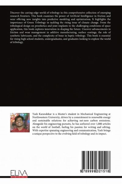 Discover the cutting-edge world of tribology in this comprehensive collection of emerging research frontiers. This book examines the power of Artificial Intelligence in friction and wear offering new insights into predictive modeling and optimization. It highlights the importance of Green Tribology in tackling the rising issue of climate change. From the tribological design on prosthetics and joint implants to the challenging conditions of space application, this book explores innovation in shaping the future. Uncover advancements in friction and wear management in additive manufacturing, surface coatings, the role of synthetic lubricants, and the complexity of bone in haptic tribology. This book is essential for rising high school students, undergraduates, and graduates looking to explore the world of tribology.
