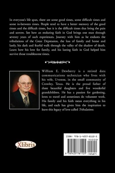 Back Cover Book Summary In everyone's life span, there are some good times, some difficult times and some in-between times. People tend to have a better memory of the good times and the difficult times, but it is the difficult times that bring the pain and sorrow. See how an enduring faith in God brings one man through seventy years of such experiences. Journey with him as he endures the tribulations of the Great Depression, the loss of family and home and lastly, his dark and fearful walk through the valley of the shadow of death. Learn how his love for family, and his lasting faith in God helped him survive those troublesome times.