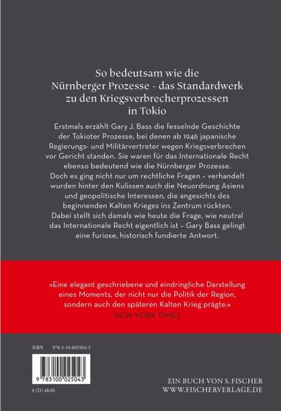 Das einzigartige Standardwerk zum wichtigsten Kriegsverbrecherprozess neben den Nürnberger Prozessen, verfasst von Gary Bass, Professor für Intenationale Beziehungen an der Princeton University. Der im Westen wenig beachtete Prozess gegen 28 Mitglieder der japanischen militärischen Führung fand nach dem Zweiten Weltkrieg in Tokio statt.