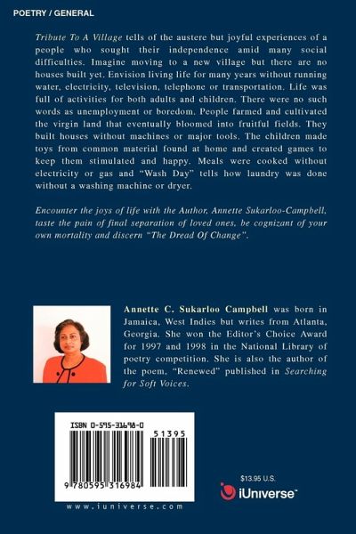 Tribute To A Village tells of the austere but joyful experiences of a people who sought their independence amid many social difficulties. Imagine moving to a new village but there are no houses built yet. Envision living life for many years without running water, electricity, television, telephone or transportation. Life was full of activities for both adults and children. There were no such words as unemployment or boredom. People farmed and cultivated the virgin land that eventually bloomed into fruitful fields. They built houses without machines or major tools. The children made toys from common material found at home and created games to keep them stimulated and happy. Meals were cooked without electricity or gas and "Wash Day" tells how laundry was done without a washing machine or dryer. Encounter the joys of life with the Author, Annette Sukarloo-Campbell, taste the pain of final separation of loved ones, be cognizant of your own mortality and discern "The Dread Of Change".