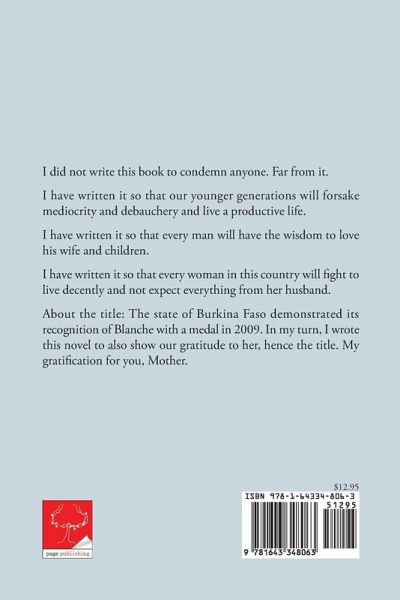 I did not write this book to condemn anyone. Far from it. I have written it so that our younger generations will forsake mediocrity and debauchery and live a productive life. I have written it so that every man will have the wisdom to love his wife and children. I have written it so that every woman in this country will fight to live decently and not expect everything from her husband. About the title: The state of Burkina Faso demonstrated its recognition of Blanche with a medal in 2009. In my turn, I wrote this novel to also show our gratitude to her, hence the title. My gratification for you, Mother.