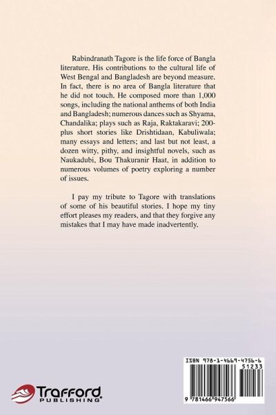 Rabindranath Tagore is the life force of Bangla literature. His contributions to the cultural life of West Bengal and Bangladesh are beyond measure. In fact, there is no area of Bangla literature that he did not touch. He composed more than 1,000 songs, including the national anthems of both India and Bangladesh; numerous dances such as Shyama, Chandalika; plays such as Raja, Raktakaravi; 200-plus short stories like Drishtidaan, Kabuliwala; many essays and letters; and last but not least, a dozen witty, pithy, and insightful novels, such as Naukadubi, Bou Thakuranir Haat, in addition to numerous volumes of poetry exploring a number of issues. I pay my tribute to Tagore with translations of some of his beautiful stories. I hope my tiny effort pleases my readers, and that they forgive any mistakes that I may have made inadvertently.