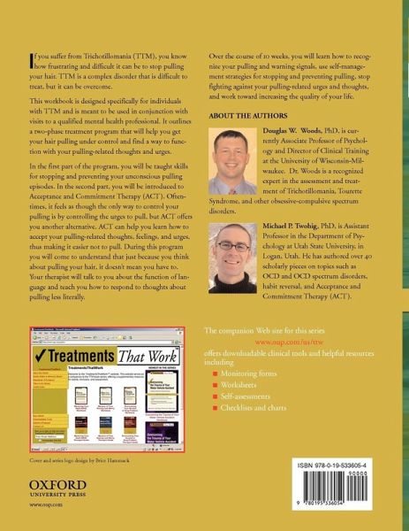 Trichotillomania (TTM) is a complex disorder which involves at least two levels of psychological functioning. At one level, it is a habitual behaviour. This type of TTM involves 'automatic pulling' and typically occurs without a person's awareness. The second type of TTM is more closely related to emotional functioning or regulation and is known as 'focused pulling'. Generally, it is believed that most individuals with TTM exhibit both types of pulling. THe most common treatment for TTM is Habit Reversal Therapy (HRT), and its main focus is the habitual, or 'automatic' aspect of the disorder. In this new treatment program, Drs Wood and Twohig have designed a treatment which combines the basic aspects of HRT with Acceptance and Commitment Therapy (ACT) to address the 'focused' aspects of the pulling. ACT seeks to alter the thoughts and feelings surrounding the pulling, and removes the compulsive aspect of the pulling urge, while HRT focuses on increasing the awareness of the pulling and teaches the person to utilise a competing behaviour instead of pulling. Together, these two techniques work to decrease all incidents of pulling, and help the client understand and come to terms with the emotional triggers of their disorder. In a clinical setting, this combined treatment was proven very effective, with high maintenance rates over a three-month period. This treatment consists of 10 60-minute sessions spread out over six weeks, with the final two sessions taking place every two weeks to ease the client out of the therapeutic environment and intrduce relapse prevention techniques. This corresponding workbook will contain monitoring forms to help the client maintain an awareness of their pulling, as well as self-assessment tests and other homework exercises.