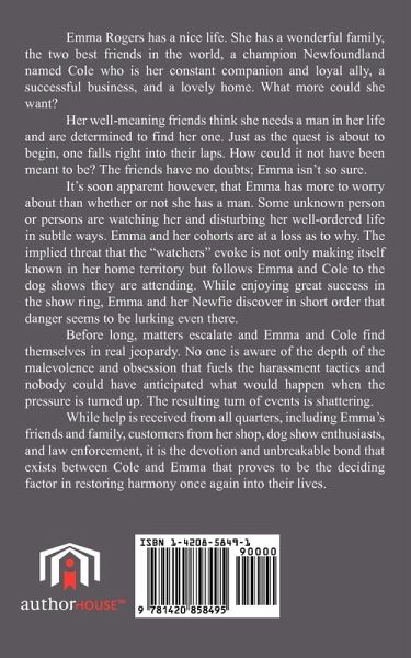 Emma Rogers has a nice life. She has a wonderful family, the two best friends in the world, a champion Newfoundland named Cole who is her constant companion and loyal ally, a successful business, and a lovely home. What more could she want? Her well-meaning friends think she needs a man in her life and are determined to find her one. Just as the quest is about to begin, one falls right into their laps. How could it not have been meant to be? The friends have no doubts; Emma isn't so sure. It's soon apparent however, that Emma has more to worry about than whether or not she has a man. Some unknown person or persons are watching her and disturbing her well-ordered life in subtle ways. Emma and her cohorts are at a loss as to why. The implied threat that the "watchers" evoke is not only making itself known in her home territory but follows Emma and Cole to the dog shows they are attending. While enjoying great success in the show ring, Emma and her Newfie discover in short order that danger seems to be lurking even there. Before long, matters escalate and Emma and Cole find themselves in real jeopardy. No one is aware of the depth of the malevolence and obsession that fuels the harassment tactics and nobody could have anticipated what would happen when the pressure is turned up. The resulting turn of events is shattering. While help is received from all quarters, including Emma's friends and family, customers from her shop, dog show enthusiasts, and law enforcement, it is the devotion and unbreakable bond that exists between Cole and Emma that proves to be the deciding factor in restoring harmony once again into their lives.
