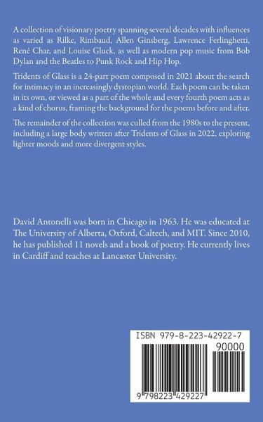 Tridents of Glass is a single long poem told in twenty-four movements, exploring love, memory, and desire in a world shaped by technology, abstraction, and collapse. Intimate lyric passages are framed by choral poems that widen into visions of cities, systems, and forces beyond individual control, placing private experience inside an unsettled modern landscape. The poem moves fluidly between the sensual and the cosmic: lovers recalled through touch, scent, and place are set against planets, entropy, and the vast indifference of the universe. Scientific and cultural references ground the work in contemporary life while giving human longing a stark sense of scale. Deliberately expansive and fragmented, Tridents of Glass embraces disjunction as part of its meaning. Influenced by writers such as T. S. Eliot, Rilke, Allen Ginsberg, René Char, Louise Glück, and Bob Dylan, it belongs to the tradition of late-modern long poems that resist easy resolution or consolation. Tridents of Glass is a work about intimacy under pressure-about love remembered clearly because it cannot be repaired, and about language persisting in a world where silence is no longer possible. The remainder of the collection was culled from the 1980s to the present, including a large body written in 2022 after Tridents of Glass, exploring lighter moods and more divergent styles.