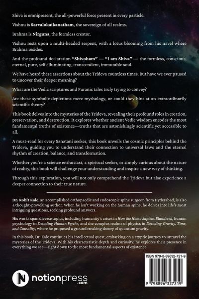 Shiva is omnipresent, the all-powerful force present in every particle. Vishnu is Sarvalokaikanatham, the sovereign of all realms. Brahma is Nirguna, the formless creator. Vishnu rests upon a multi-headed serpent, with a lotus blooming from his navel where Brahma resides. And the profound declaration "Shivoham"- "I am Shiva"- the formless, conscious, eternal, pure, self-illuminating, transcendent, immutable soul. We have heard these assertions about the Trideva countless times. But have we ever paused to uncover their deeper meaning? What are the Vedic scriptures and Puranic tales truly trying to convey? Are these symbolic depictions mere mythology, or could they hint at an extraordinarily scientific theory? This book delves into the mysteries of the Trideva, revealing their profound roles in creation, preservation, and destruction. It explores whether ancient Vedic wisdom encodes the most fundamental truths of existence-truths that are astonishingly scientific yet accessible to all. A must-read for every Sanatani seeker, this book unveils the cosmic principles behind the Trideva, guiding you to understand their connection to universal laws and the eternal rhythm of creation, balance, and transformation. Whether you're a science enthusiast, a spiritual seeker, or simply curious about the nature of reality, this book will challenge your understanding and inspire a new way of thinking. Through this exploration, you will not only comprehend the Trideva but also experience a deeper connection to their true nature