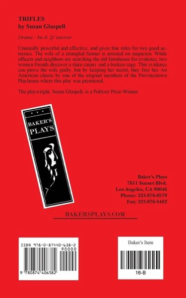 Drama / Characters: 3 male, 2 female Scenery: interior Unusually powerful and effective, and gives fine roles for two good actresses. The wife of a strangled farmer is arrested on suspicion. While officers and neighbors are searching the old farmhouse for evidence, two women friends discover a slain canary and a broken cage. This evidence can prove the wife guilty, but by keeping her secret, they free her. An American classic by one of the original members of the Provincetown Playhouse where