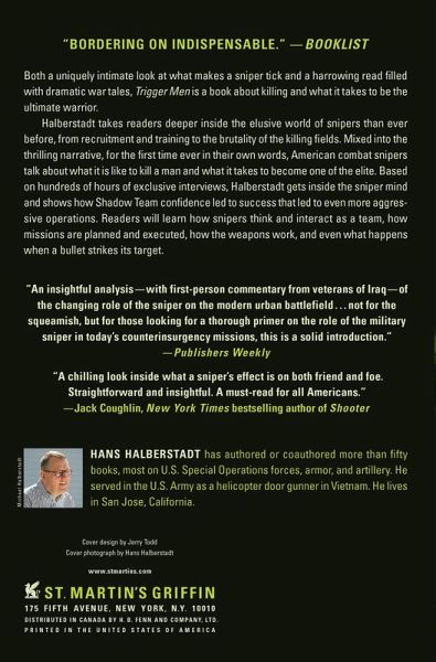 Both a uniquely intimate look at what makes a sniper tick and a harrowing read filled with dramatic war tales, Trigger Men is a book about killing and what it takes to be the ultimate warrior. Hans Halberstadt takes readers deeper inside the elusive world of snipers than ever before, from recruitment and training to the brutality of the killing fields. Mixed into the thrilling narrative, for the first time ever in their own words, American combat snipers talk about what it is like to kill a man and what it takes to become one of the elite. Based on hundreds of hours of exclusive interviews, Halberstadt gets inside the sniper mind and shows how Shadow Team confidence led to success that led to even more aggressive operations. Readers will learn how snipers think and interact as a team, how missions are planned and executed, how the weapons work, and even what happens when a bullet strikes its target.
