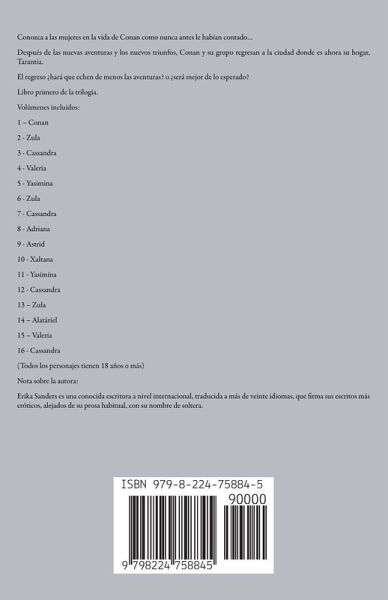 Conozca a las mujeres en la vida de Conan como nunca antes le habían contado... Después de las nuevas aventuras y los nuevos triunfos, Conan y su grupo regresan a la ciudad donde es ahora su hogar, Tarantia. El regreso ¿hará que echen de menos las aventuras? o ¿será mejor de lo esperado? Libro primero de la trilogía. Volúmenes incluidos: 1 - Conan 2 - Zula 3 - Cassandra 4 - Valeria 5 - Yasimina 6 - Zula 7 - Cassandra 8 - Adriana 9 - Astrid 10 - Xaltana 11 - Yasimina 12 - Cassandra 13 - Zula 14 - Alatáriel 15 - Valeria 16 - Cassandra (Todos los personajes tienen 18 años o más) Nota sobre la autora: Erika Sanders es una conocida escritora a nivel internacional, traducida a más de veinte idiomas, que firma sus escritos más eróticos, alejados de su prosa habitual, con su nombre de soltera.