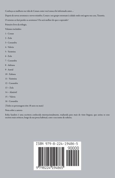 Conheça as mulheres na vida de Conan como você nunca foi informado antes ... Depois de novas aventuras e novos triunfos, Conan e seu grupo retornam à cidade onde está agora sua casa, Tarantia. O retorno os fará perder as aventuras? Ou será melhor do que o esperado? Primeiro livro da trilogia. Volumes incluídos: 1 - Conan 2 - Zula 3 - Cassandra 4 - Valeria 5 - Yasimina 6 - Zula 7 - Cassandra 8 - Adriana 9 - Astrid 10 - Xaltana 11 - Yasimina 12 - Cassandra 13 - Zula 14 - Alatáriel 15 - Valeria 16 - Cassandra (Todos os personagens têm 18 anos ou mais) Nota sobre a autora: Erika Sanders é uma escritora conhecida internacionalmente, traduzida para mais de vinte línguas, que assina os seus escritos mais eróticos, longe da sua prosa habitual, com o seu nome de solteira.