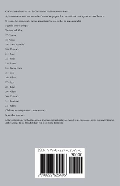 Conheça as mulheres na vida de Conan como você nunca ouviu antes ... Após novas aventuras e novos triunfos, Conan e seu grupo voltam para a cidade onde agora é sua casa, Tarantia. O retorno fará com que eles percam as aventuras? ou será melhor do que o esperado? Segundo livro da trilogia. Volumes incluídos: 17 - Tamira 18 - Onna 19 - Ghita y Armati 20 - Cassandra 21 - Xina 22 - Yosei 23 - Arwen 24 - Tetra y Diana 25 - Zula 26 - Valeria 27 - Agra 28 - Estari 29 - Valeria 30 - Cassandra 31 - Kaminari 32 - Valeria (Todos os personagens têm 18 anos ou mais) Nota sobre a autora: Erika Sanders é uma conhecida escritora internacional, traduzida para mais de vinte línguas, que assina os seus escritos mais eróticos, longe da sua prosa habitual, com o seu nome de solteira.