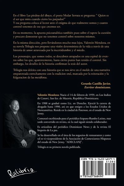 En el libro Las piedras del ábaco, el poeta Medar Serrata se pregunta: " Quien es el ser que mira cuando cierro los parpados?" Y esa pregunta coloca al lector ante el enigma de que realmente somos y cuanto control tenemos de eso que creemos ser. En su momento, la apuesta psicoanalítica también puso sobre el tapete la cuestión y procuro demostrar que no tenemos control sobre nosotros mismos. En la misma dirección, pero llevándonos mucho mas lejos, Valentin Mendoza, en su novela Trilogía nos propone una visión determinista de la vida a través de una historia de amor atravesada por la incertidumbre y el miedo. Los personajes, que somos todos, se descubren atrapados en una espiral de eventos sobre los que, aparentemente, hasta cierto punto han tenido el control. Sin embargo, los detalles de la historia confirman la tesis del autor. Trilogía nos deleita con una historia que se nos sirve en el molde de una narrativa emparentada estrechamente con la tradicion oral, marcada por la reiteración y la fulguracion de las metáforas. Gerardo Castillo Javier. Escritor dominicano.