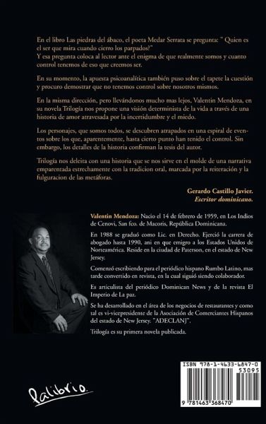 En el libro Las piedras del ábaco, el poeta Medar Serrata se pregunta: " Quien es el ser que mira cuando cierro los parpados?" Y esa pregunta coloca al lector ante el enigma de que realmente somos y cuanto control tenemos de eso que creemos ser. En su momento, la apuesta psicoanalítica también puso sobre el tapete la cuestión y procuro demostrar que no tenemos control sobre nosotros mismos. En la misma dirección, pero llevándonos mucho mas lejos, Valentin Mendoza, en su novela Trilogía nos propone una visión determinista de la vida a través de una historia de amor atravesada por la incertidumbre y el miedo. Los personajes, que somos todos, se descubren atrapados en una espiral de eventos sobre los que, aparentemente, hasta cierto punto han tenido el control. Sin embargo, los detalles de la historia confirman la tesis del autor. Trilogía nos deleita con una historia que se nos sirve en el molde de una narrativa emparentada estrechamente con la tradicion oral, marcada por la reiteración y la fulguracion de las metáforas. Gerardo Castillo Javier. Escritor dominicano.