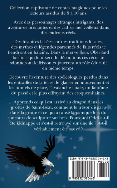Collection captivante de contes magiques pour les lecteurs assidus de 8 à 10 ans. Avec des personnages étranges intrigants, des aventures prenantes et des cadres merveilleux dans des endroits réels. Des histoires basées sur des traditions locales, des mythes et légendes parsemés de faits réels te tiendront en haleine. Dans le merveilleux Oberland bernois qui leur sert de décor, tous ces récits te sdonneront le frisson et joueront un rôle éducatif en même temps. Découvre l'aventure des spéléologues perdus dans les entrailles de la terre, le glacier en mouvement et les tunnels de glace, l'avalanche fatale, un fantôme du passé et le plus effrayant des croquemitaines. Apprends ce qui est arrivé au dragon dans les grottes de Saint-Béat, comment le trésor disparu dans la grotte et ce qui a causé la panique lors du concours de sculpture sur bois. Pourquoi Oddi a-t-il été kidnappé et s'est-il retrouvé sur une île ? A-t-il véritablement été sauvé ?
