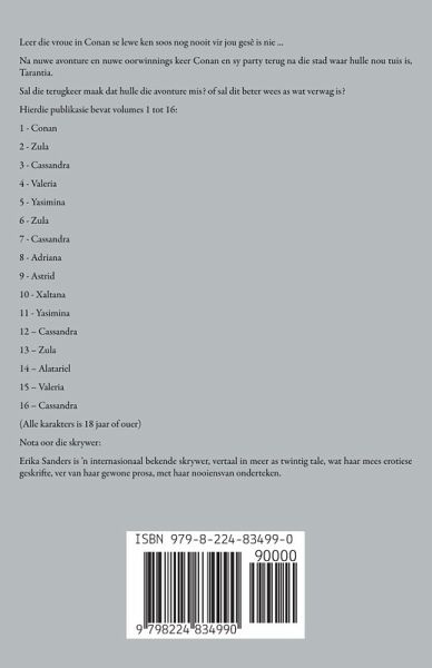 Leer die vroue in Conan se lewe ken soos nog nooit vir jou gesê is nie ... Na nuwe avonture en nuwe oorwinnings keer Conan en sy party terug na die stad waar hulle nou tuis is, Tarantia. Sal die terugkeer maak dat hulle die avonture mis? of sal dit beter wees as wat verwag is? Hierdie publikasie bevat volumes 1 tot 16: 1 - Conan 2 - Zula 3 - Cassandra 4 - Valeria 5 - Yasimina 6 - Zula 7 - Cassandra 8 - Adriana 9 - Astrid 10 - Xaltana 11 - Yasimina 12 - Cassandra 13 - Zula 14 - Alatariel 15 - Valeria 16 - Cassandra (Alle karakters is 18 jaar of ouer) Nota oor die skrywer: Erika Sanders is 'n internasionaal bekende skrywer, vertaal in meer as twintig tale, wat haar mees erotiese geskrifte, ver van haar gewone prosa, met haar nooiensvan onderteken.