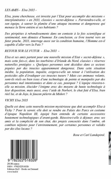 Il s'agit ici de la Trilogie des aventures d'Elsa.LES AMIS - Elsa 2035 - Elsa, jeune chercheuse, est investie par l'Etat pour accomplir des missions « interplanétaires » en 2035, classées « secret-défense ».Parviendra-t-elle, et son équipe, à sauver la planète d'une attaque inconnue et dangereuse qui menace la Terre entière et ses habitants ?Des péripéties à rebondissements dans un contexte à la fois scientifique et sentimental, non dénuées d'humour.En conclusion, ce livre tourné vers un futur proche, 2035, interroge aussi sur la condition humaine, l'Homme est-il capable d'aller vers la Paix ?RETOUR SUR LE FUTUR - Elsa 2035 -Elsa et ses amis partent pour une nouvelle mission d'Etat « secret-défense », mais cette fois-ci, dans les tourbières d'Irlande du Nord, classées « réserves naturelles protégées ».Quelques personnes sont décédées dans ce secteur, piquées par des insectes apparemment dangereux. Dans cette situation inédite, la population, inquiète, exigera-t-elle un retour à l'utilisation des pesticides afin d'éradiquer ces insectes tueurs ?Mais ces animaux volants, sont-ils réels ou bien issus d'une technologie de pointe et manipulés par des personnes mal intentionnées et dans ce cas, pourquoi ?L'équipe réussira-t-elle sa mission, élucider l'énigme avec des moyens de haute technologie à leur disposition, mais aussi, avec l'aide de Norbert, le chat futé d'Elsa, bien réel lui, et de Jojo, le faucon pèlerin de Midori ?VICHY - Elsa 2035 -Quelle est donc cette nouvelle mission mystérieuse que doit accomplir Elsa à Vichy ?Pour le savoir, elle doit se rendre au Palais des Parcs en costume d'époque Napoléon III, équipé bien entendu de certains accessoires hautement technologiques d'avant-garde.Réussira-t-elle à déjouer, avec ses amis et la complicité de son chat, des projets concoctés dans l'ombre, oh combien néfastes pour l'environnement, par certaines personnes et validés par des élus locaux ?Rose et Carl Landepirol.