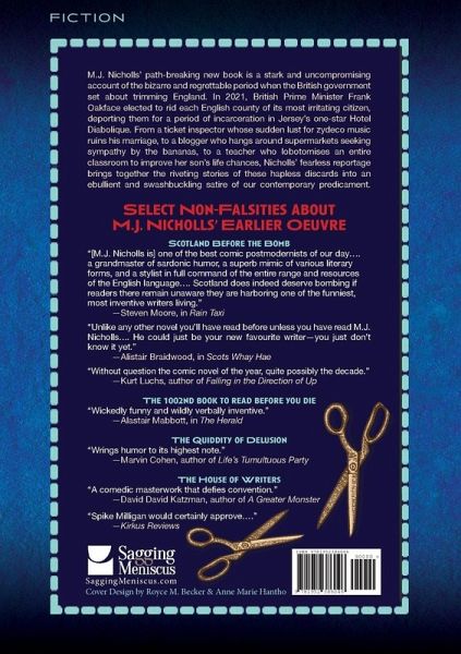 Fiction. Illustrated by Kathleen Nicholls. M.J. Nicholls' path-breaking new book is a stark and uncompromising account of the bizarre and regrettable period when the British government set about trimming England. In 2021, British Prime Minister Frank Oakface elected to rid each English county of its most irritating citizen, deporting them for a period of incarceration in Jersey's one-star Hotel Diabolique. From a ticket inspector whose sudden lust for zydeco music ruins his marriage, to a blogger who hangs around supermarkets seeking sympathy by the bananas, to a teacher who lobotomises an entire classroom to improve her son's life chances, Nicholls' fearless reportage brings together the riveting stories of these hapless discards into an ebullient and swashbuckling satire of our contemporary predicament.