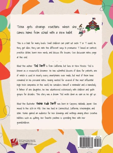 Trina gets strange reactions when she comes home from school with a new habit. This is a book for many levels. Small children can point out each T or T sound. As they get older, they can note the different ways to pronounce T based on context, practice diction, learn new words, and discuss life lessons. See the discussion notes page at the end.